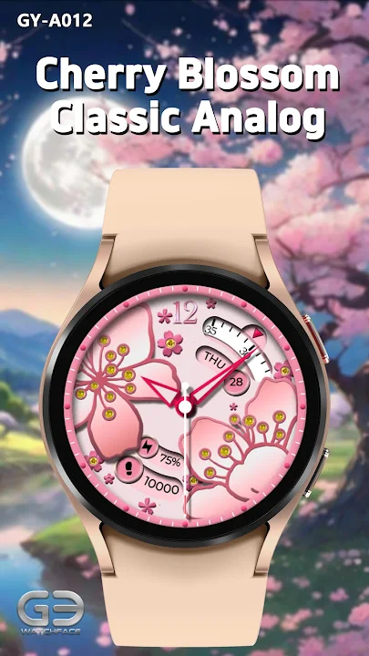 A pink classic analog watch screen with cherry blossoms as its theme.