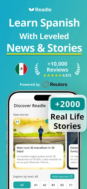Readle is a Spanish language learning app with real-world news & stories. It is the world's first CEFR-graded reader to help you learn Spanish. Easily read & listen to news & stories anytime, anywhere – Take 10 minutes daily to learn Spanish and create a reading habit.