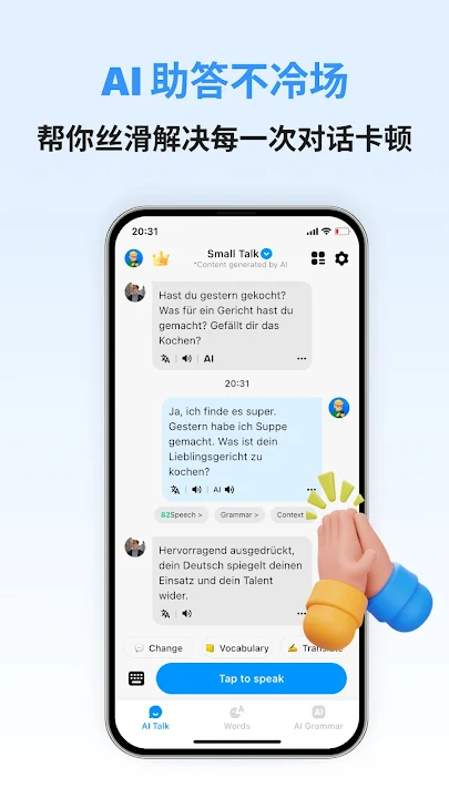 德语智能口语 APP 是一款专为你设计的智能德语学习助手,完美适配 A1-C2 等级学习需求,特别适合德语零基础学习者和急需实用德语技能的职场人士。通过 AI 对话练习的个性化课程、趣味互动练习 和 真实场景模拟,让你轻松掌握日常交流、商务会话和旅行等必备的德语技能。