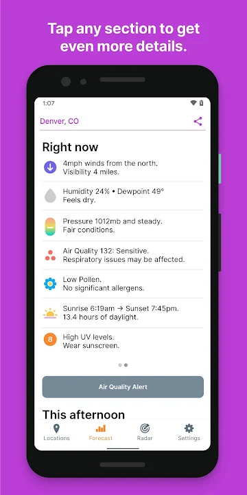 • Notifications: see a persistent notification or get a morning weather report every day.
