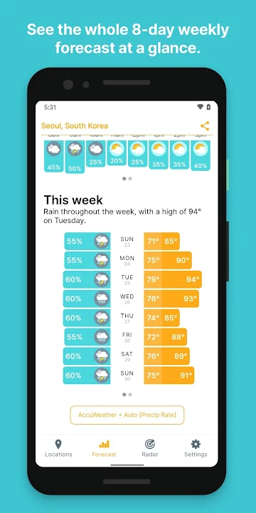 • Forecast customization and smart bonus info, with extra details for hourly precipitation rate, wind, UV, visibility, and Feels Like temperatures.