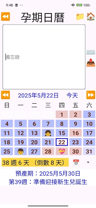 *孕期日曆(點選左上角設定日期後會自動計算目前幾週幾天、距離預產期還有幾天,當週胎兒的發展,並顯示孕期日曆,可以加入備忘錄文字以及當天代表圖示,點選孕期備忘錄旁邊的內文搜尋按鈕,會根據備忘錄內容搜索懷孕寶典顯示相關懷孕資訊,在設定預產期頁面點擊「設定預產期」按鈕,系統將自動產生一份孕期備忘錄。您也可以分享該孕期備忘錄給另一半,在另一半app內直接貼上孕期備忘錄,並點擊「設定預產期」按鈕複製孕期備忘錄。)