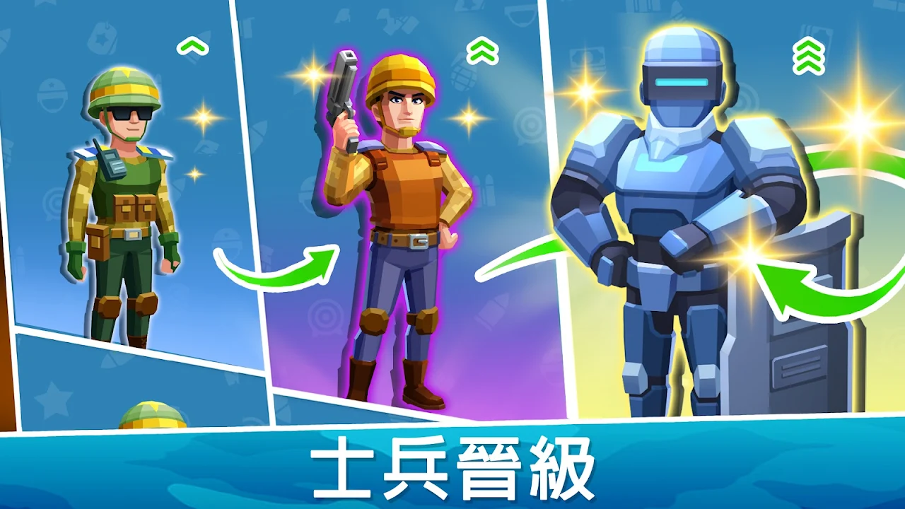 選擇你所需要的士兵類型並招募他們,讓更多新兵前來參軍! 幫助他們完成所有的訓練,成為更強大的士兵,集結他們,向敵人發起進攻,出色的完成每一次軍事任務!