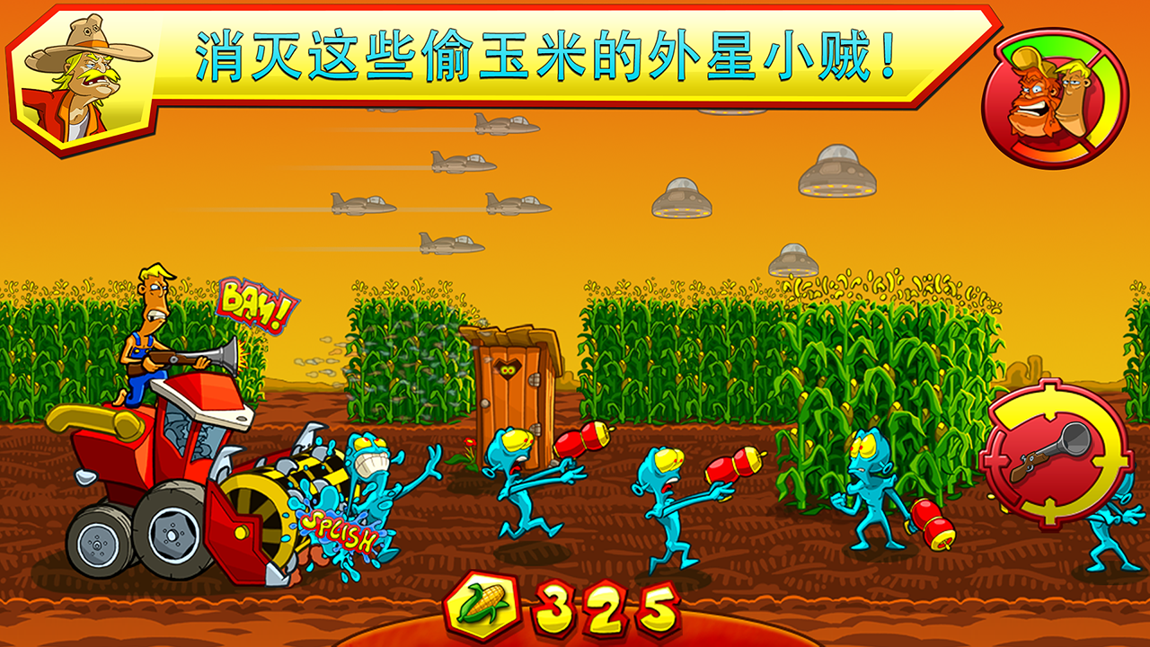 UFO盯上了老Pops的农场!快使用一个又大又疯狂的强力武器阻止这些外星人小偷,防止他们偷走即将收割的玉米!跳上你的玉米收割机,消灭那些落单的蓝色小个子侵略者吧!现在,不论是武装飞船还是危险的障碍,都阻止不了这场全世界最大的外星人狩猎啦!躲开外星的收割机歼灭光线,直面可怕的火星恶魔,英勇保卫老Pops的玉米农场吧!