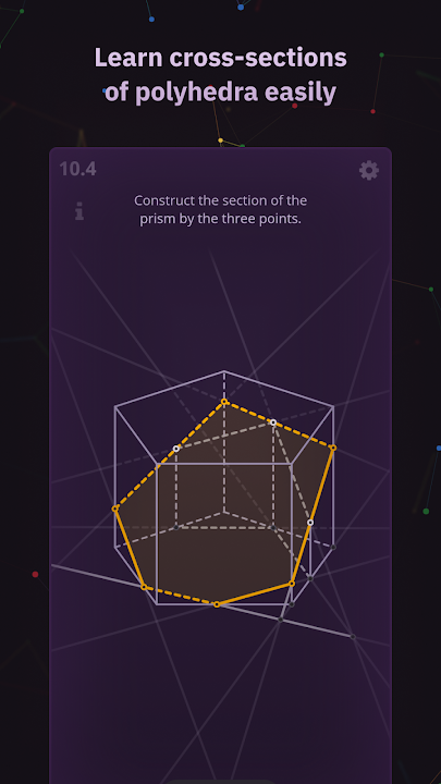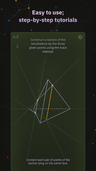 XSection 是一款立体几何解题训练器。它教你如何从三维欧氏空间理解多面体、直线和平面的二维表示。所有问题都无需复杂的计算即可解决。应用包含所需的理论知识和解释。如果你忘记了某个定义,可以立即在应用的术语表中找到。