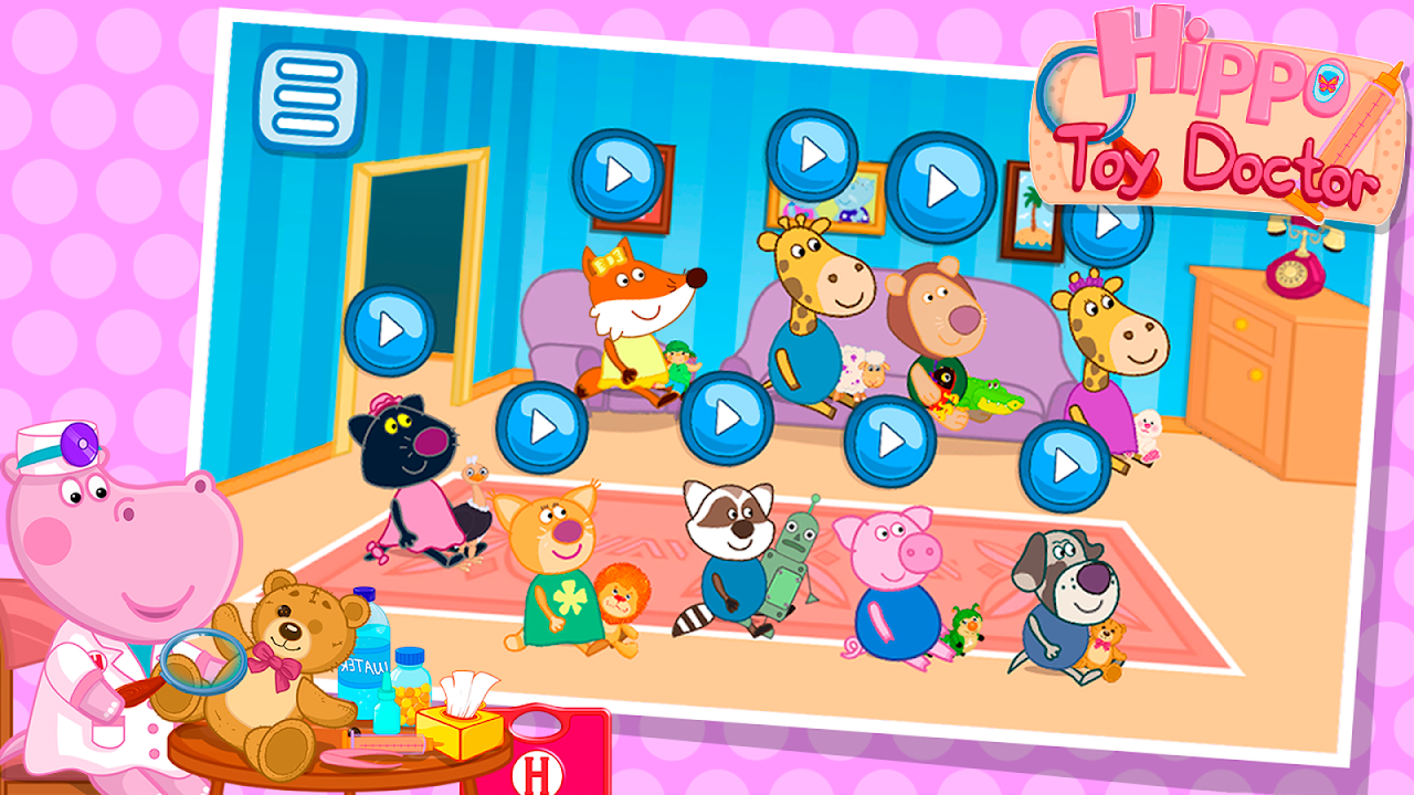 Kids doctor Hippo is always ready to heal dolls and toys in vet hospital