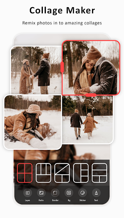 • Photo Grid: Create captivating collages and photo grids. Choose from various templates, customize layouts, and add borders or text to personalize your creations. The collage maker is perfect for showcasing multiple photos in a single frame, whether for a social media post, a story, or a special occasion.