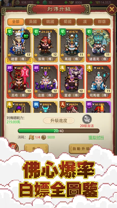 Whether you appreciate Guan Yu's bravery or admire Zhuge Liang's resourcefulness, whether you favor Diao Chan's beauty or appreciate Huang Yueying's talents, you can find the role you want here. Single attacking generals, group attacking generals, sixth-level capable generals... There are endless ways to match the lineup, adapting to local conditions to help you play each dungeon, and the rich character illustrations are more than just decorations!