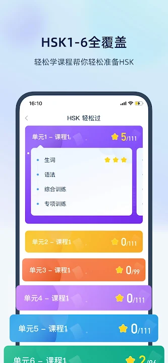 单元制,每个单元都有对应的HSK词汇,语法,专项训练;