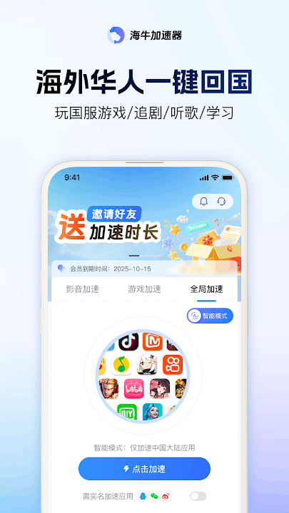 海牛加速器是一款服务海外华人、留学生、海外务工者、出境旅游人士的回国VPN工具,帮助海外华人和留学生有效降低网络延迟,支持海外回国多种需求,包括但不限于:追剧、听歌、打游戏、看体育赛事、在线直播,查阅文献、海外抢票,办公、炒股等。一键加速回国,满足海外华人各种回国需求。