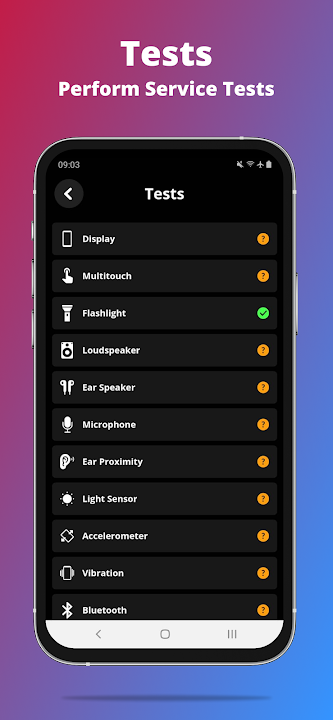 Benchmark your device with the following parts and optimize your device with Automatic tests. You can test Display, Multi-touch, Flashlight, Loudspeaker, Ear Speaker, Microphone, Ear Proximity, Accelerometer, Vibration, WI-Fi, Fingerprint, Volume Up Button & Volume Down Button