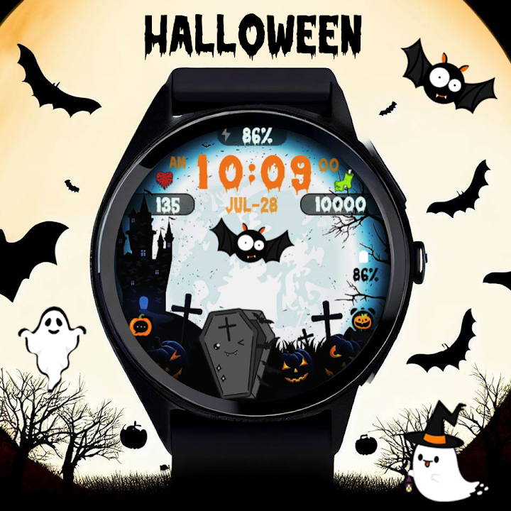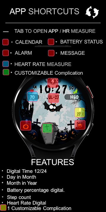 ⌚︎ On this scary & animated Halloween themed watch-face you will see all important information like Digital time 12-24h time format with bloody Halloween’s font in option to change 5 different Halloween’s color palette, Date Info, Steps count - Skeleton/Zombie Leg icon, Heart rate – Scary bloody Heart icon, Alarm icon & messages icons designed as pumpkins all is pasted on scary cemetery background with dark pumpkins.