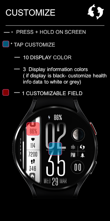 - 3 Health info complication color options ( When you customize display color to black - then you change complication text to white)