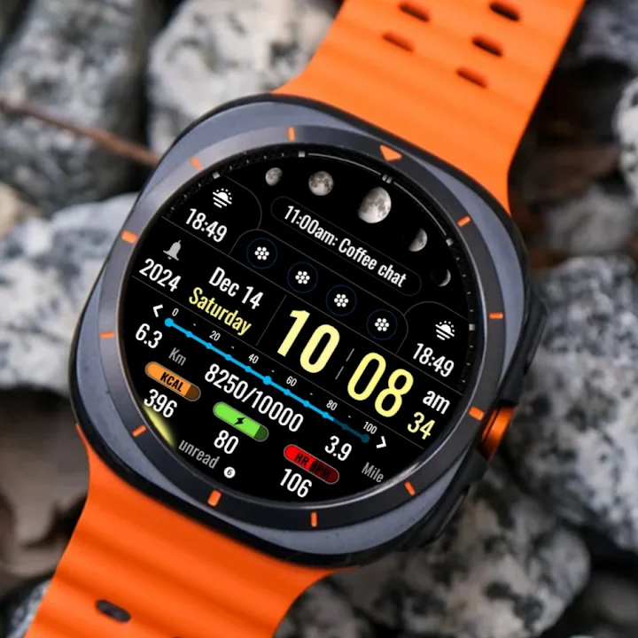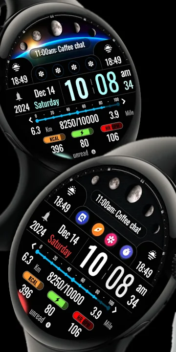 Modern Digital & Informative Clock face with health & workout information many application launchers and customizable areas with health & fitness data.