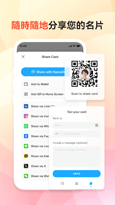 通過個性化簡訊、電子郵件或專屬URL分享名片。利用二維碼功能,實現輕鬆、即時分享。