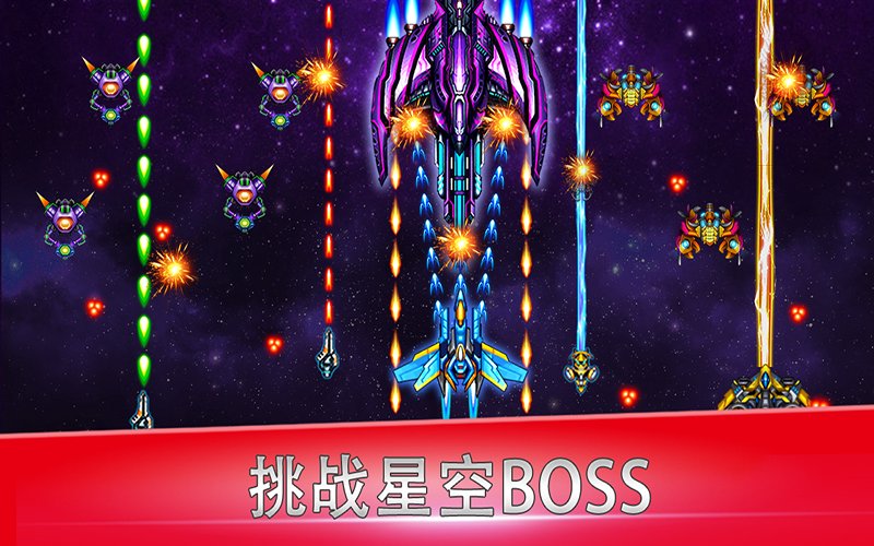 挑战BOSS是最激动人心的事情,火力集中,并用不同的子弹攻击,只有触摸屏才能避免射击。熟练的操作非常重要,保护您的飞船安全并累积损坏。它不仅是一个天空射击游戏,而且还让你对生活休闲时间更加快乐