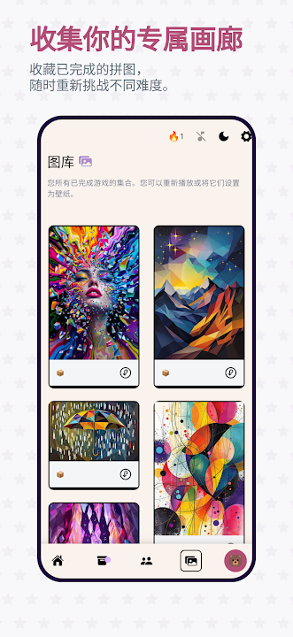 - 收藏画廊:已完成的图片可重复挑战,还可切换难度