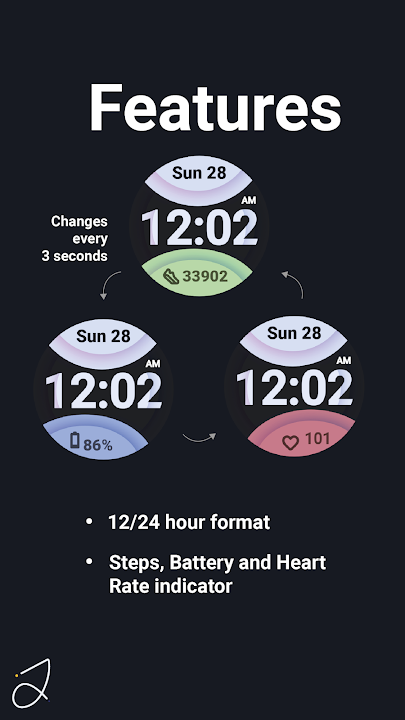 - 此表盘仅适用于 API +30 的 Wear Os 设备。