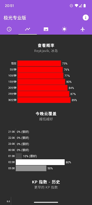 - 查找当前的KP指数以及看到北极光的可能性。