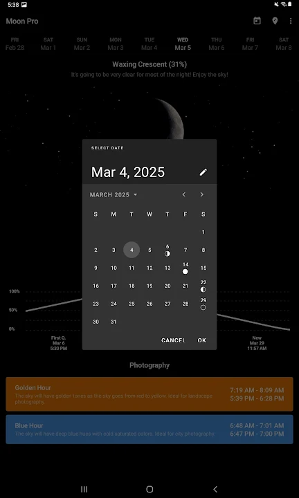 My Moon Phase 是追踪農曆的最佳應用。它採用時尚的深色設計,可以輕鬆查看當前月亮週期、月出和月落時間等信息以及下一次滿月時間等附加信息。如果您對月球攝影感興趣,還可以了解黃金時段和藍色時段的時間,以便拍攝最美麗的照片。