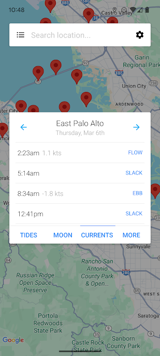 - See predictions for the currents (the slacks, ebbs and flows for each day) at selected locations around the US! Just try to view tide times as you normally would, if there's a currents station nearby you'll see an extra tab for "Currents".