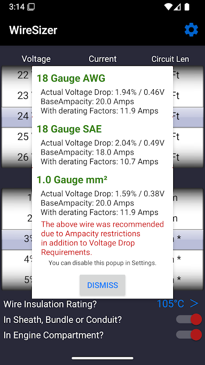 WireSizer 會自動計算電路所需的最小線規(假設使用銅線),並考慮安裝和溫度條件下的電壓降。計算結果會與載流能力(安培容量)限制進行比對,以防止使用不安全的過小線規電線。