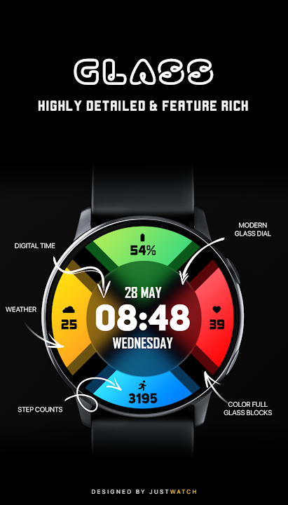 玻璃風格錶盤,帶有醒目的時間、統計數據和 10 種顏色選項