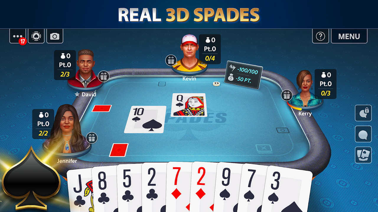 • 3D GRAPHICS – The first Spades game with breathtakingly realistic 3D graphics.