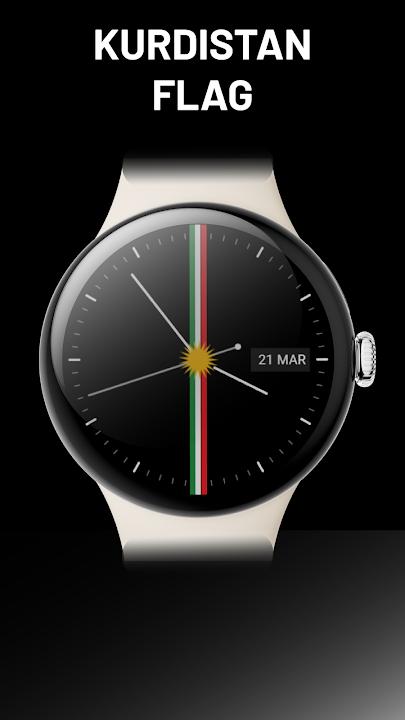 It is a simple yet stylish watch face with the kurdish flag. It has a minimalistic and classy look. It shows the time very elegantly and has no extra fetures tha makes the watch look messy. The sun spins with the seconds hand and makes the flag look alive.