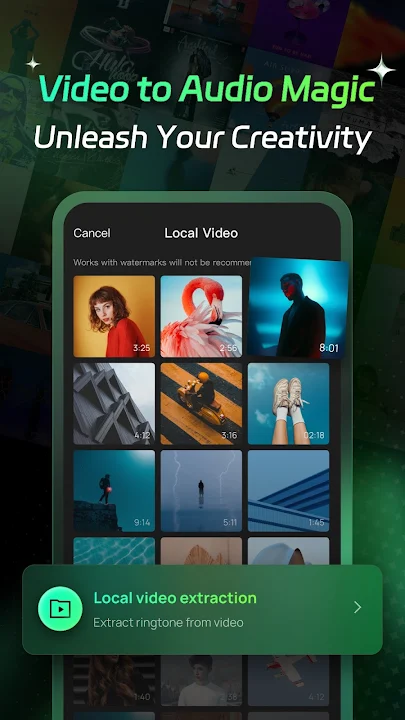 我們獨特的視訊轉音訊擷取技術可讓您輕鬆將喜愛的視訊剪輯轉換為音頻,將其變成獨特的鈴聲。