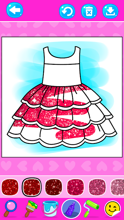 Cute Glitter Dress Coloring Game for Girls! Design your own Doll Dress with sparkling glitters and elegant patterns. Save your Designs to dress up your princess doll with them. This game is made specially for girls who love to have a blast coloring and designing beautiful outfits.