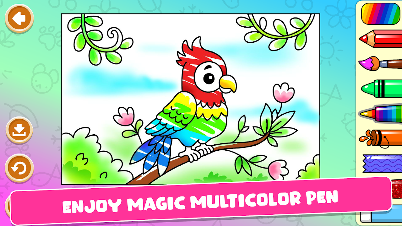 Unlike other coloring games, this game has many different coloring pages with cute drawings and pictures for your children to color in various themes like Farm, Jungle, Birds, etc.