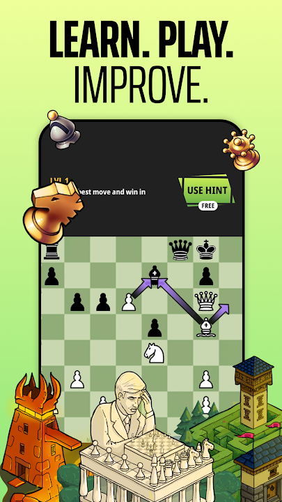 With our latest chess app, you can enhance your skills from beginner to master. Review your games, analyze key moves, and elevate your chess proficiency. Improve while solving engaging chess puzzles created by Grandmasters and expert trainers.