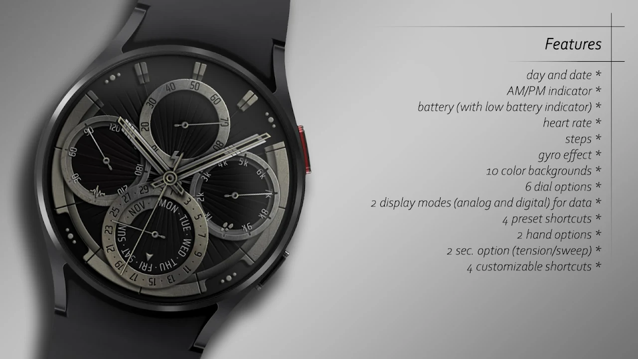 - 3 種錶盤選項(含老化效果)