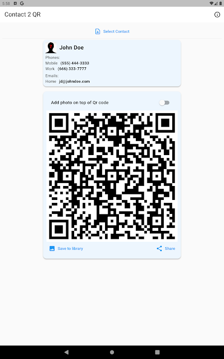 Contact 2 QR is an amazing application that lets you convert your contacts information into QR codes that you can easily share with anyone. No more typing or spelling errors, just scan the code and save the contact in your phone. You can also customize the QR codes with different colors and shapes to make them more attractive and personal. Contact 2 QR is the ultimate tool for networking and socializing in the digital age. Download it now and start sharing your contacts in a fun and convenient way!