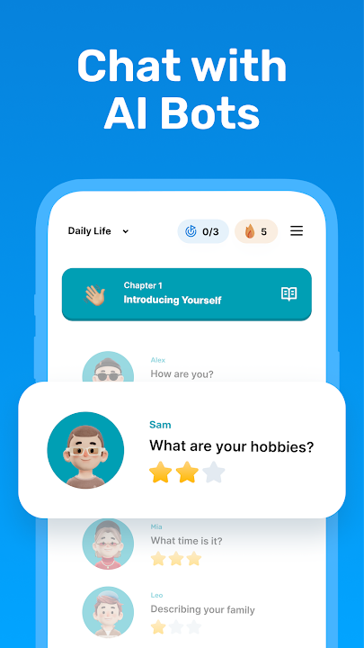 In the app, you can simply chat or speak with dozens of AI Bots on anything you like, in your desired language, and get auto-corrected by the AI.