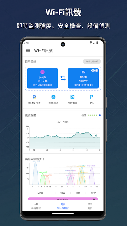 2.WIFI訊號監控:即時偵測訊號強度,顯示MAC、頻道、IP、速率等關鍵訊息,偵測安全性,列出已連接設備,幫助您輕鬆管理網路。