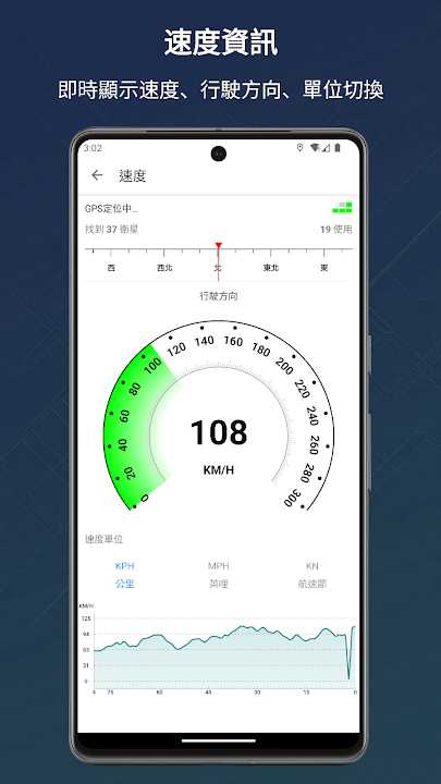 6.速度追蹤:顯示設備移動速度(公里/小時、英里/小時、速度節可選)、方向和衛星連線數量,確保導航定位準確。