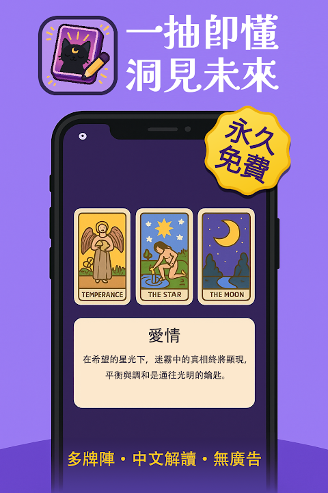 全部免費:占卜牌陣與核心功能永遠對所有用戶開放,無隱藏付費牆。