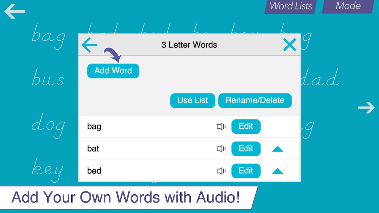 Writing Wizard is the perfect app to help your child learn how to write the letters of the alphabet, numbers, and words through a fun system carefully designed to maintain motivation. Add your own words such as your child's name for even more fun!