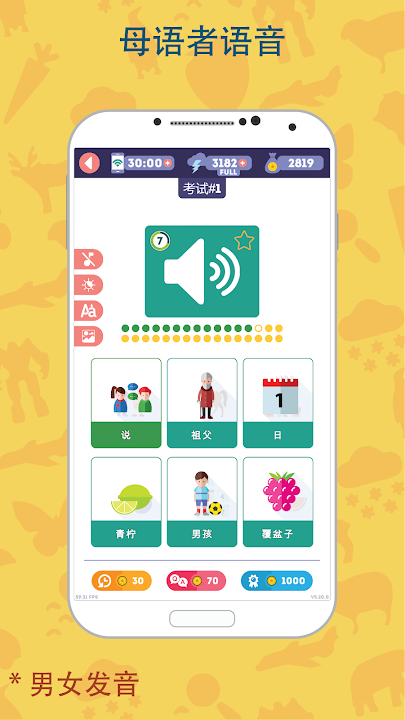不需要知道如何阅读 如果您还不会阅读,那就没问题! 每个单词都有使用您的语言的转录! 对于更有经验的人,在设置中,您可以选择语音转录(跟字典一样)。