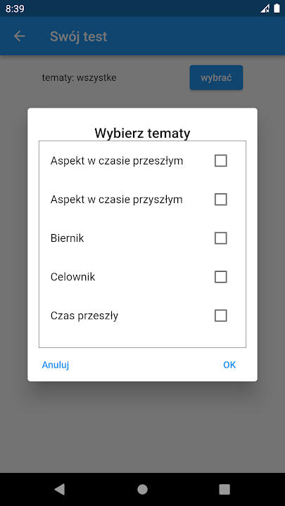 Istnieje możliwość stworzenia testu z kilku różnych tematów lub własnego testu.