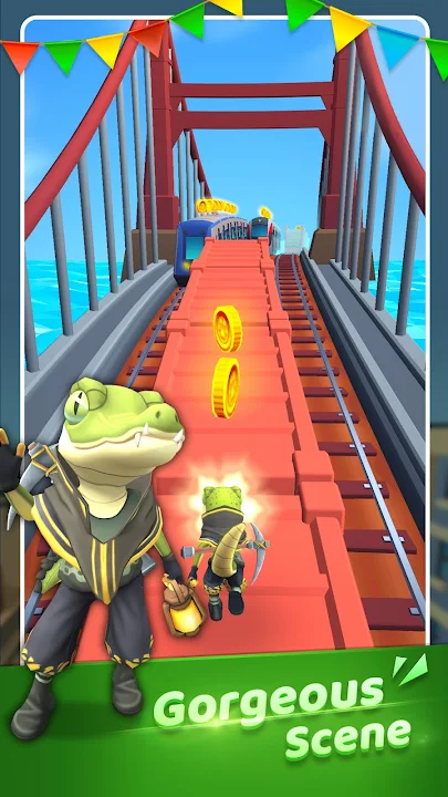 可爱的浣熊和动物们在迎面驶来的火车前飞奔躲避。动物奔跑的活泼身影,以及穿梭于障碍之间的乐趣!精彩的滑板之旅,驾驭各种滑板驰骋!高超的躲避技巧,体验快速冲刺的快感!挑战更高难度的关卡!快来加入最刺激的奔跑吧!