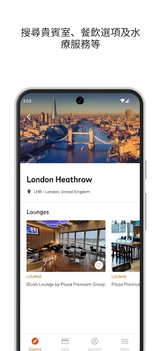 - 只需輸入國家、城市或機場,即可搜尋附近的貴賓室