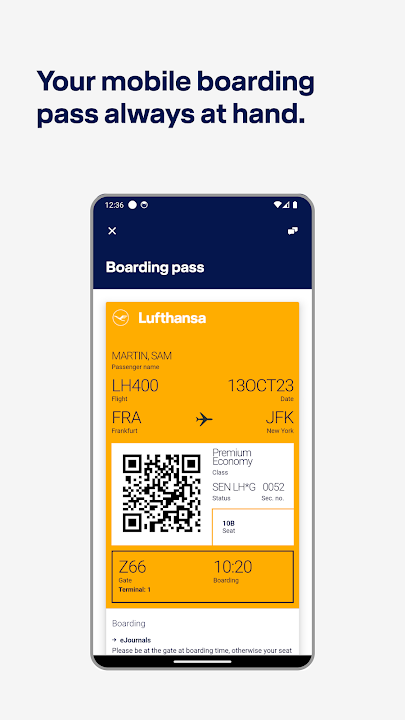• Flight ticket and onboard services: With the Lufthansa app, you always have your mobile boarding pass and onboard services at your fingertips – even when you’re offline. Access all relevant flight information as needed and always stay informed about any changes, without having to ask the flight crew.
