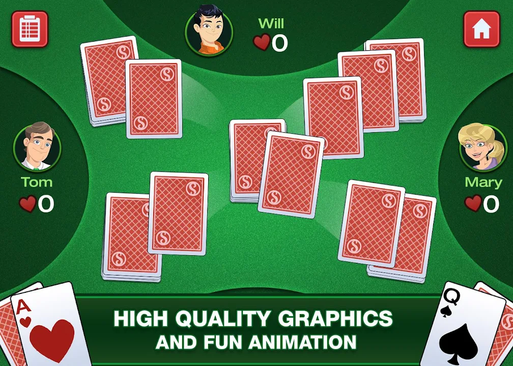 Play the best classic Hearts card game designed specifically for Android! Simply Hearts gives you the fun and relaxing Hearts experience you know and love. Play anywhere, with three intelligent computer opponents that feel so realistic it's like they’re sitting at the table with you. The popular card game, also known as Rickety Kate, Black Lady, Black Maria, Dame de Pique and Black Widow, is a family card game favorite. Download and play the best free Hearts game wherever you go.