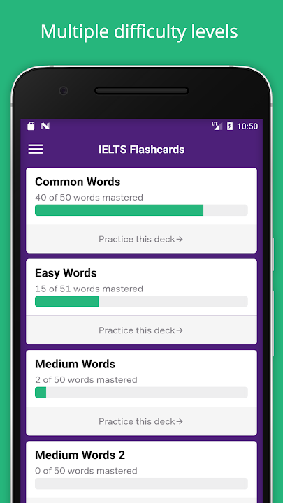 - Decks of flashcards for multiple difficulty levels; easy, intermediate and advanced