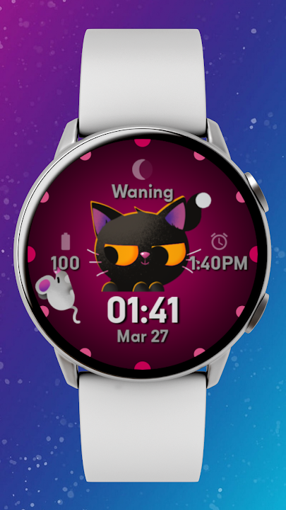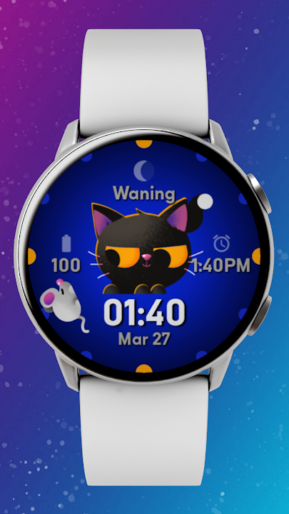 向手腕上的新猫科动物伙伴问好! Meow 是一款充满活力、俏皮的表盘,上面有一只冷酷的黑猫、一只好奇的小老鼠,所有重要的健康统计数据一目了然。