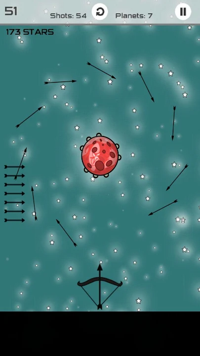 射箭月亮是一個冒險遊戲的水平。 1級等於宇宙中的一星級。拍攝在每個星球箭頭鼓鼓的圓形按鈕,連續完成1級。