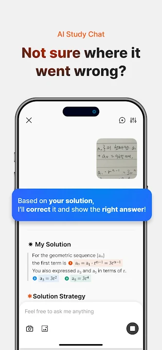 AI even spots mistakes you missed, so you can fully understand while studying alone. Now it’s even easier in chat! Try asking, “Explain this step again,” or “Give me an easier example.”